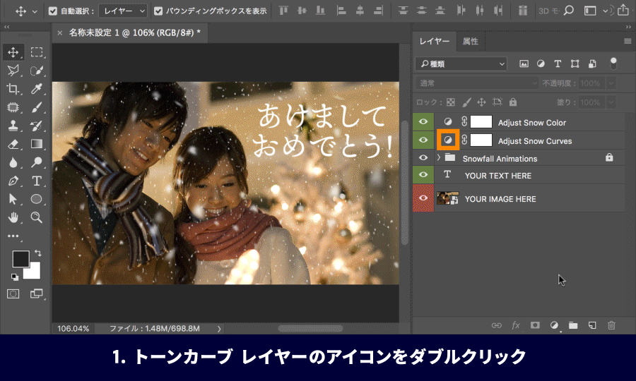 最後は、色です。まず、「Adjust Snow Curves」レイヤーの「レイヤーサムネール」アイコンをダブルクリックします。このレイヤーは「トーンカーブ」を使って画像を補正するための調整レイヤーで、「属性」パネルの「トーンカーブ」が自動的に開きます。