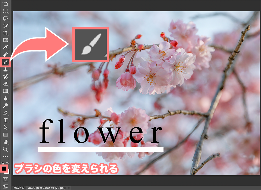 絵を描くときは、ブラシツールをクリックして、ツールバーの下の左側をクリックして色を変えられます。