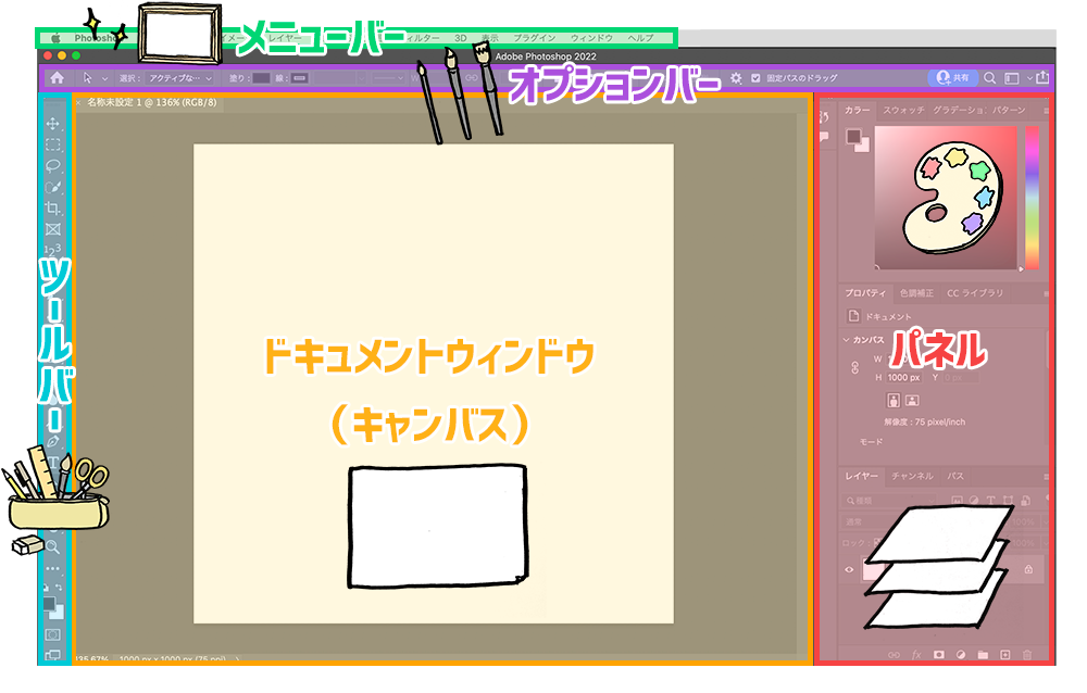 Photoshopの画面のどこがどこか覚えられないというときは、ぜひこのイメージを思い出してください。
