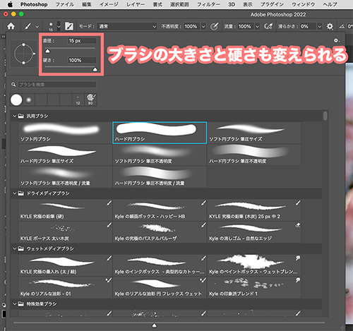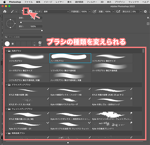 そうすると、ここでブラシの種類を変えることができるので、ここで好きなブラシの種類を選びます。