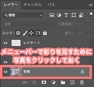 次にメニューバーを使って、写真に彩りを足していきたいので、写真をクリックしておきます。