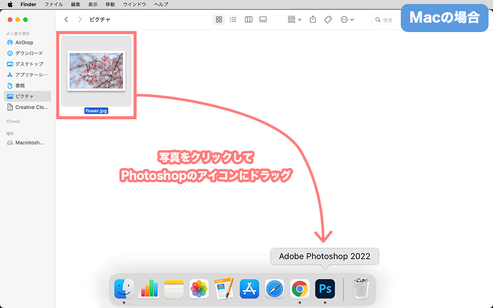 Macの場合は、もっと簡単に、写真が入っているフォルダを開いて、写真をクリックしてドラッグしてPhotoshopのアイコンの上で離します。
