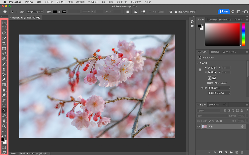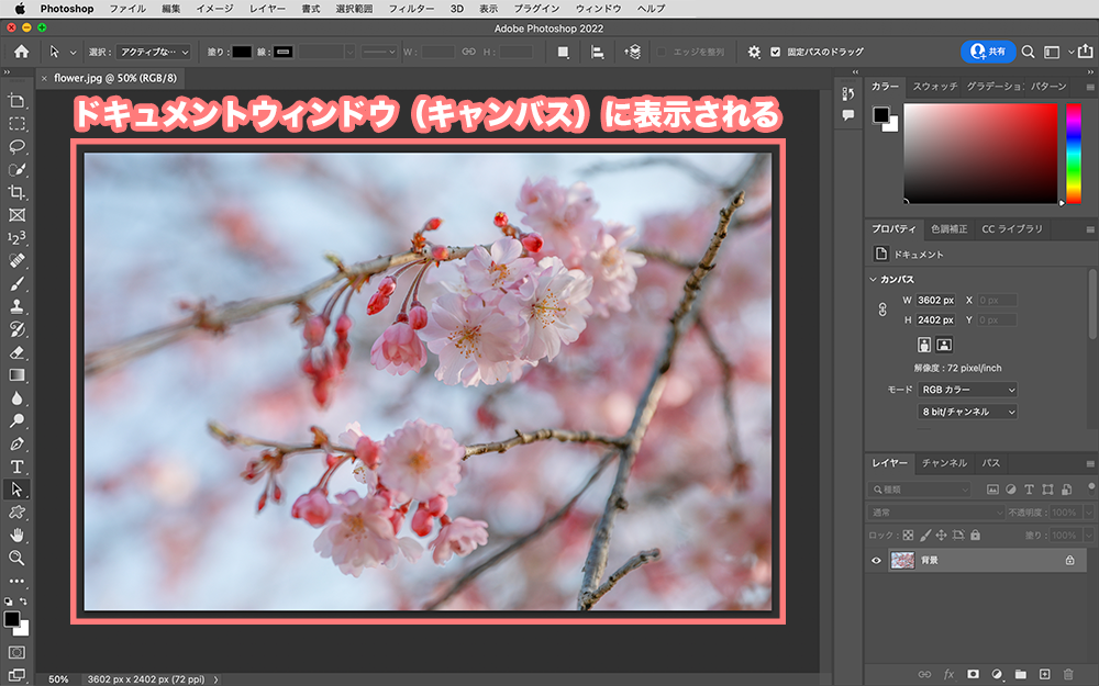 そうするとPhotoshopに写真が追加され、ドキュメントウィンドウ(キャンバス)に表示されます。