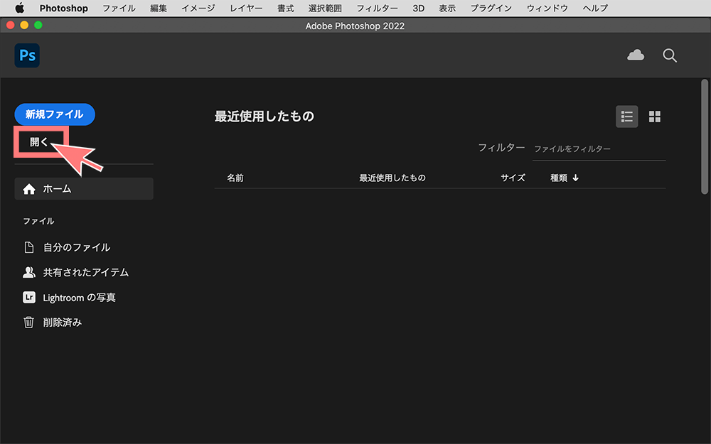 Photoshopを開いて「開く」から写真を追加できます。