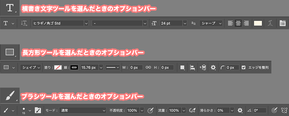 オプションバーでは、ツールバーで選んだツールによって表示するものが変わります。