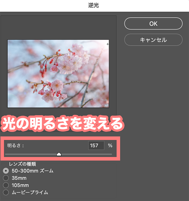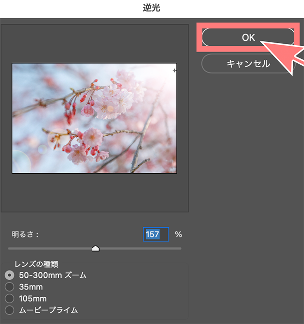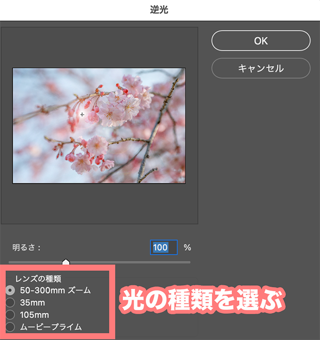 そうすると小さな画面が出てくるので、下の4つの逆光から入れたい光の種類を選びます。