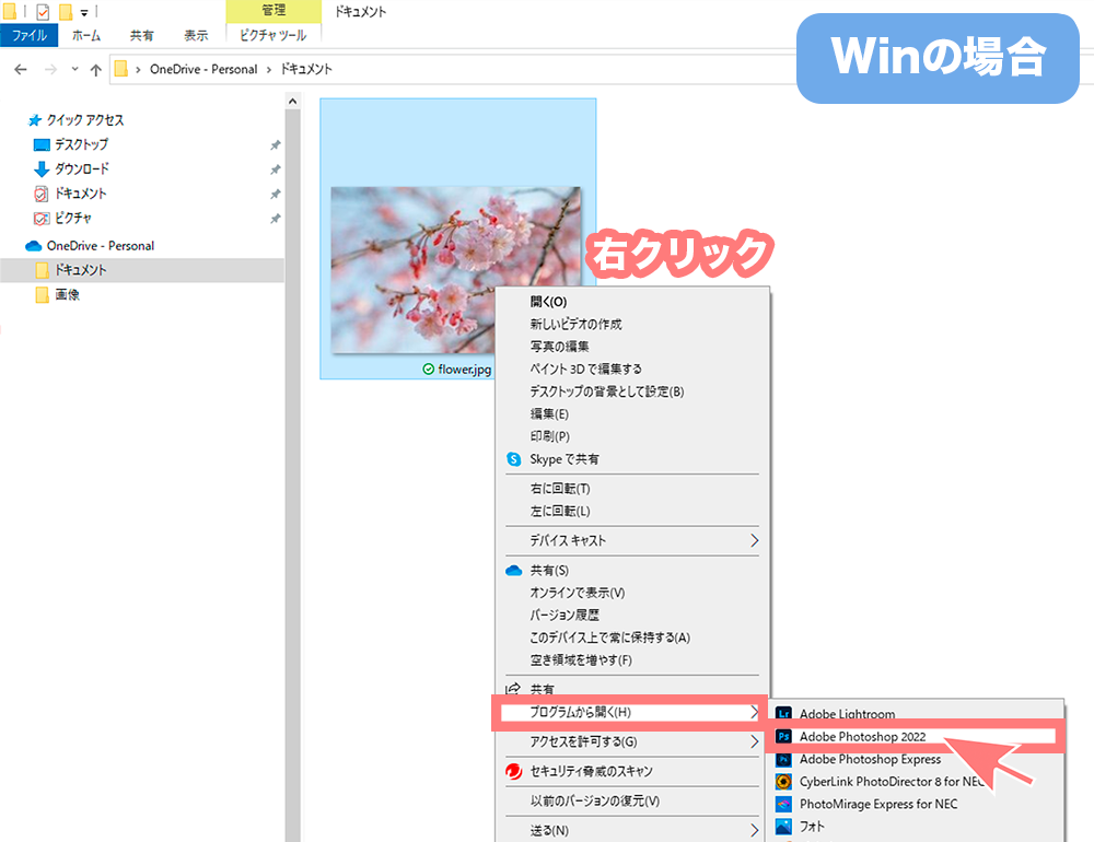 Windowsの場合、写真をクリックして、右クリック▶プログラムから開く▶Photoshopを選びます。