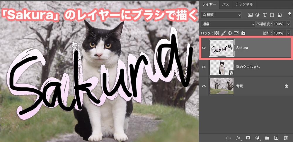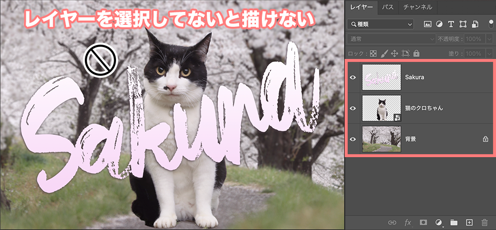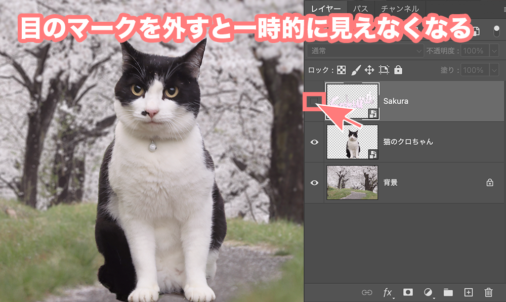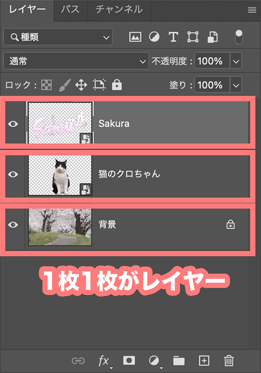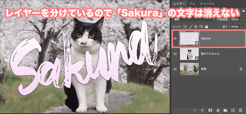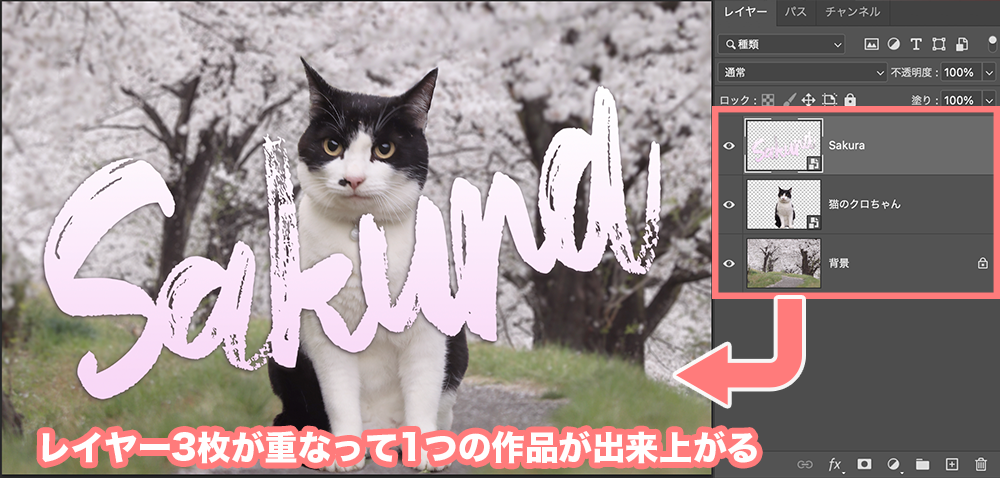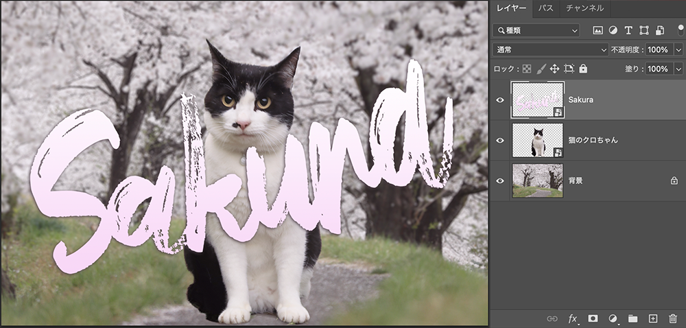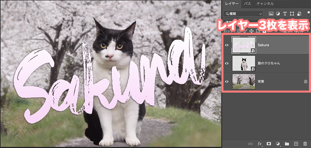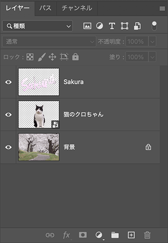 今は下から桜の「背景」のレイヤー、「猫のクロちゃん」の切り抜き写真のレイヤー、「Sakura」の文字のレイヤーと並んでいます。