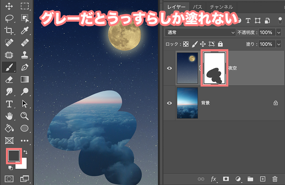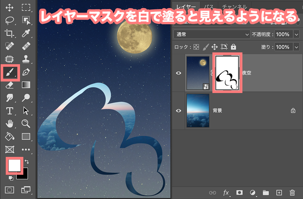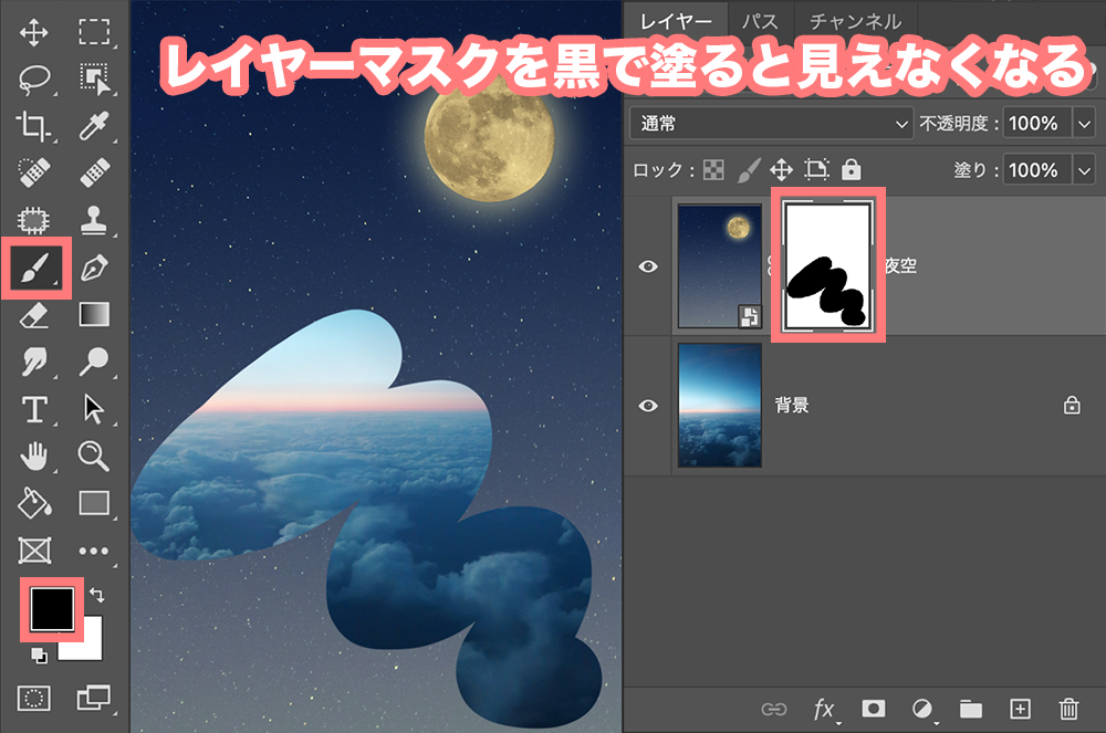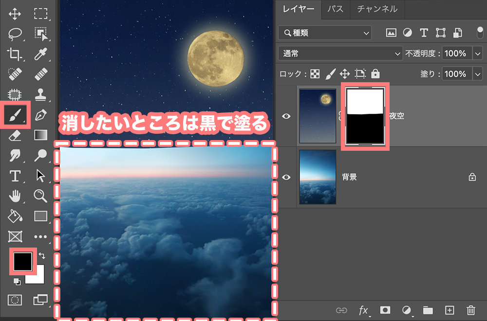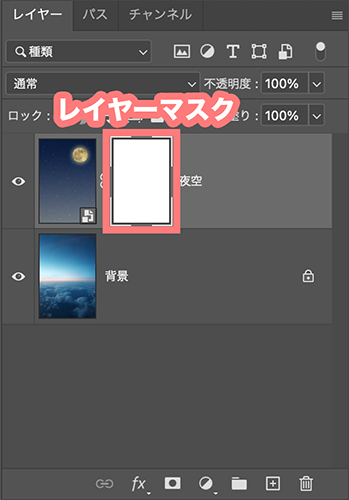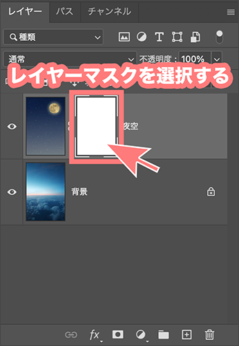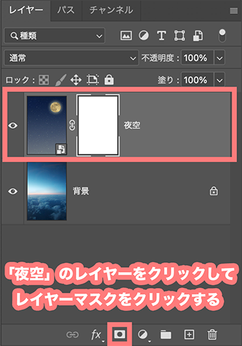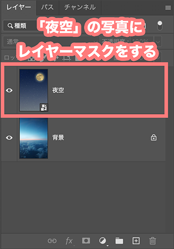 では、「夜空」のレイヤーにレイヤーマスクを足していきます。