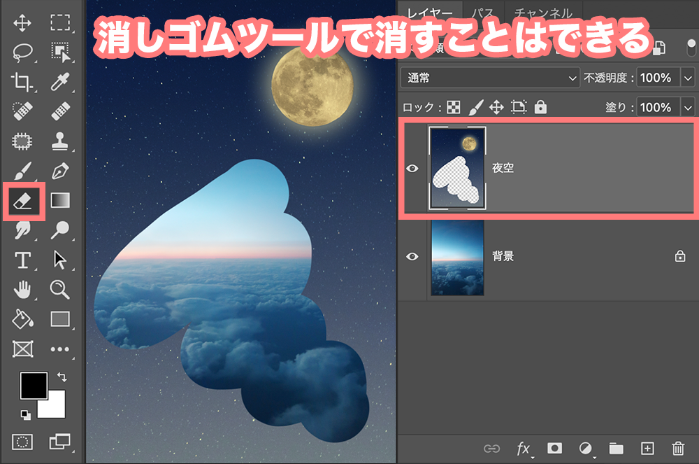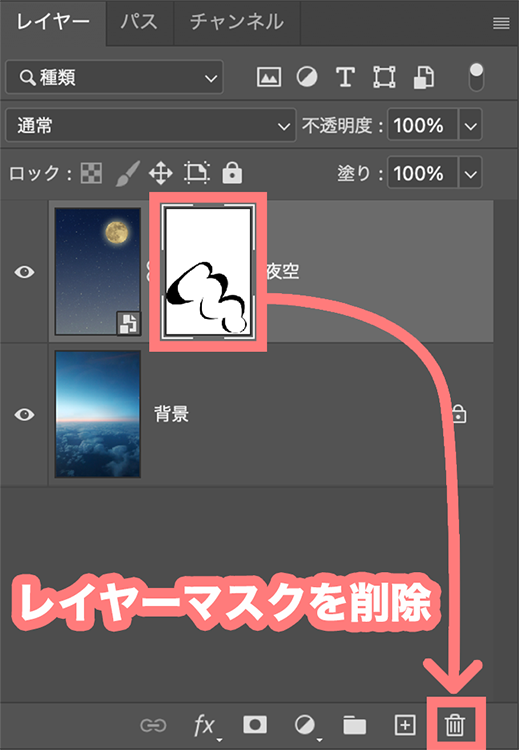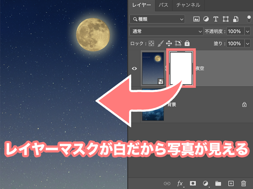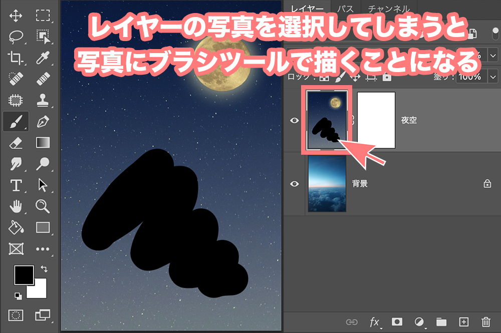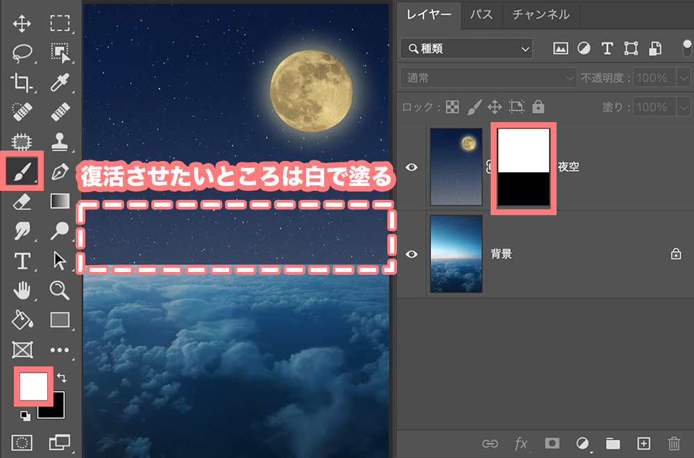 では、「夜空」のレイヤーにレイヤーマスクを足していきます。