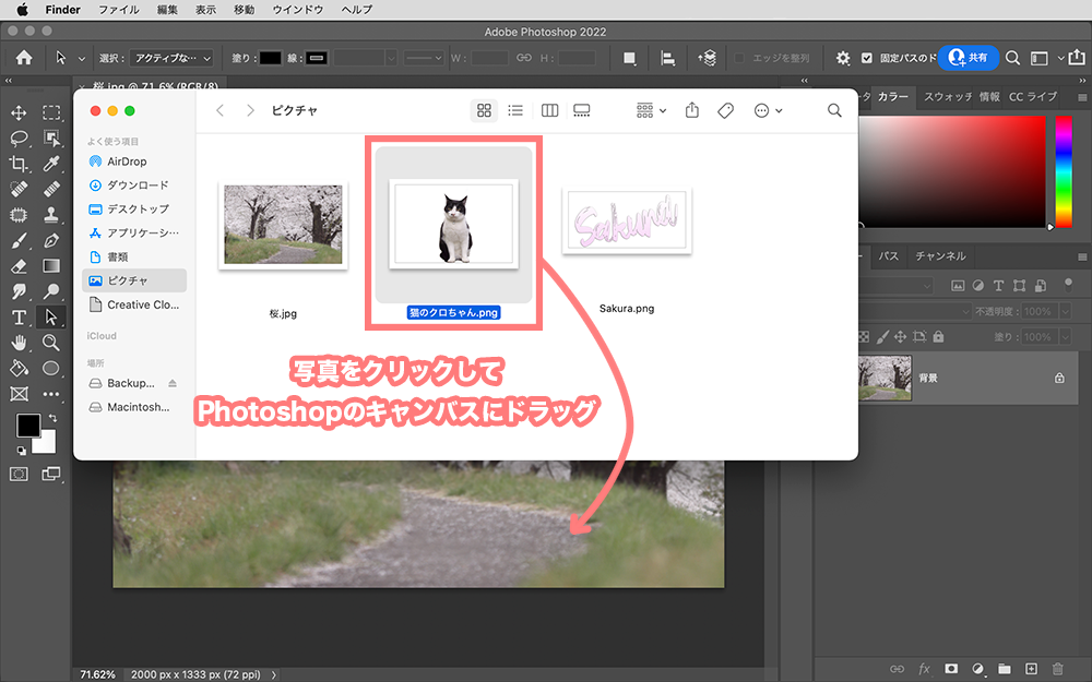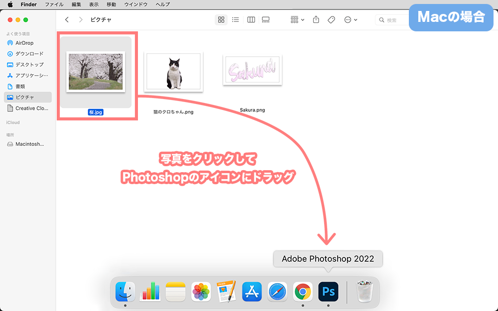 ダウンロードしたら、まず「桜」の写真を入れていきたいので、Macの場合、写真をクリックして、Photoshopのアイコンのところに持ってきて離します。