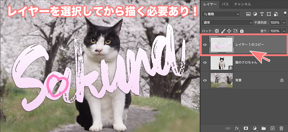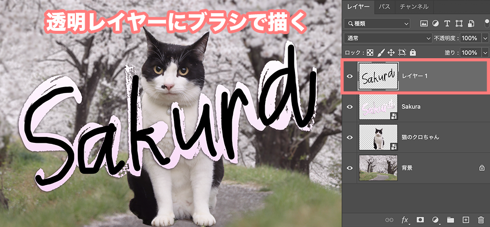 レイヤーパネルで上にあるものほど優遇されるので、キャンバス上でも「Sakura」の文字のレイヤーは隠れずに見えます。