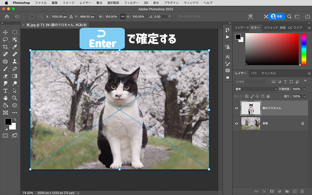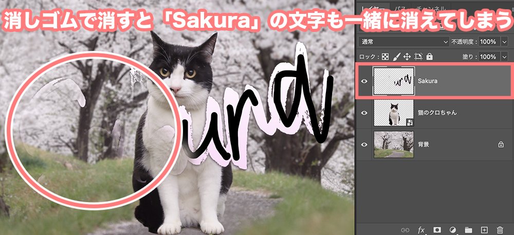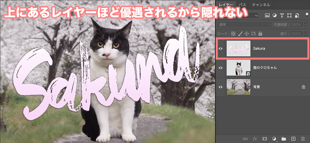 そうすると、先ほどは隠れずに見えていた「Sakura」の文字も、「猫のクロちゃん」の切り抜き写真によって一部が見えなくなりました。