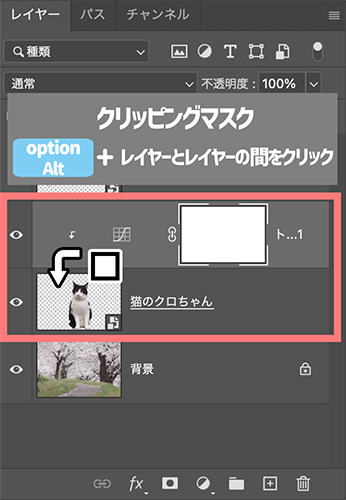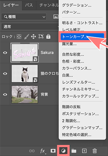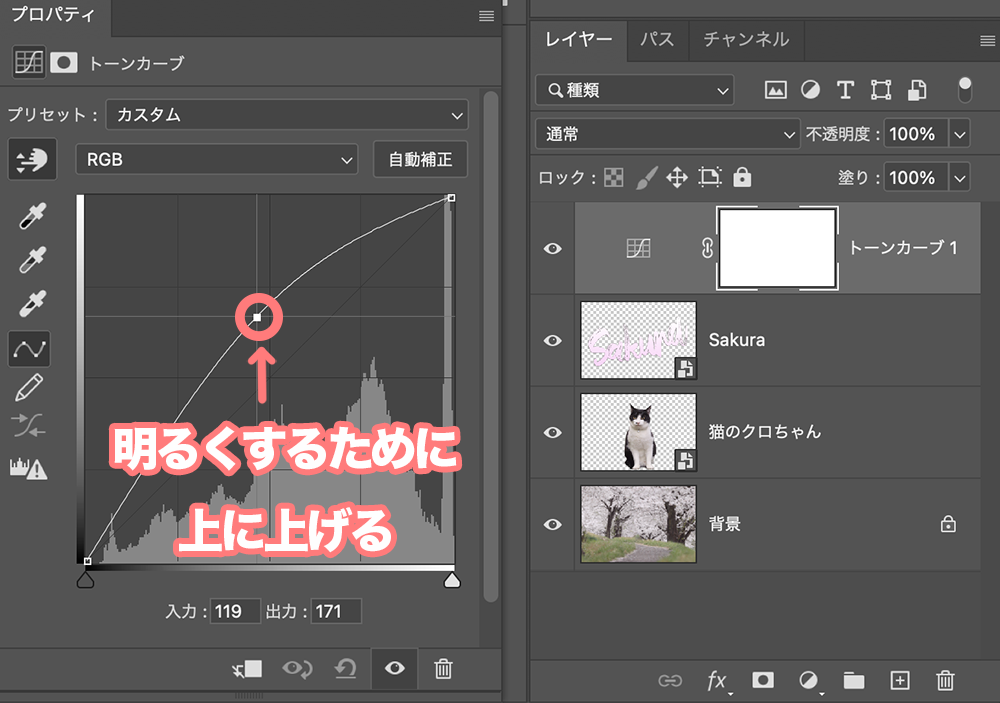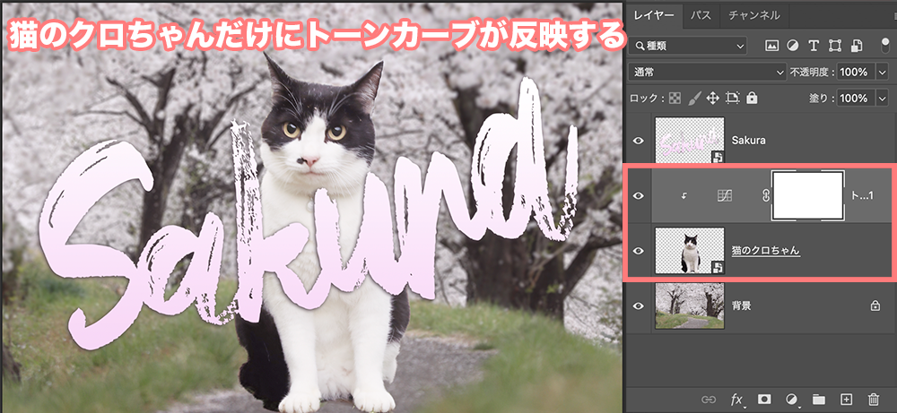 そして反映させたい「猫のクロちゃん」のレイヤーの上にトーンカーブのレイヤーを置いて、optionを押しながらレイヤーとレイヤーの間をクリックします。