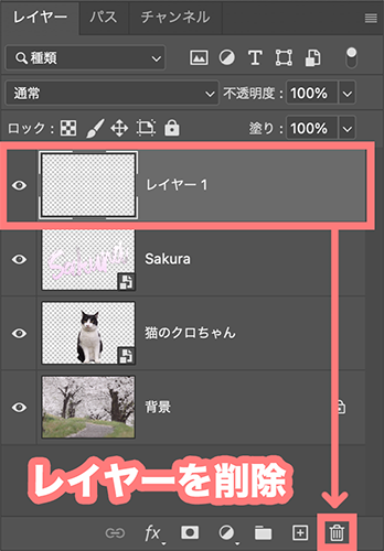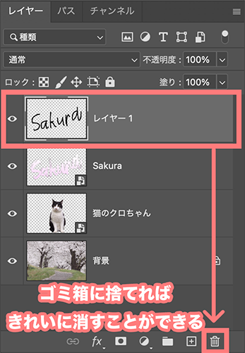そしてあとから「やっぱり消したい」というときは、このレイヤーをクリックしてドラッグして、ゴミ箱に入れます。