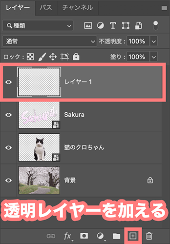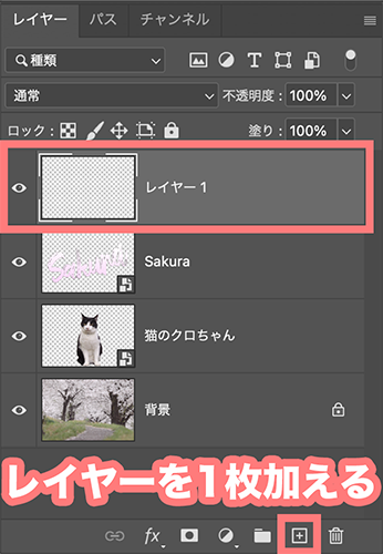レイヤーパネルの右下のプラスマークをクリックして、レイヤーを1枚足します。