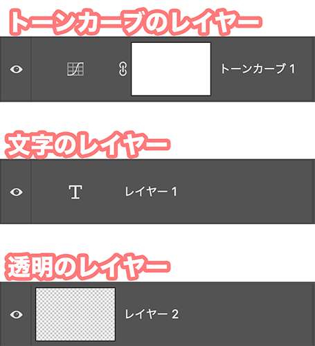 写真のレイヤー以外にも、トーンカーブなどの調整ができるレイヤー、文字のレイヤー、透明なレイヤーなどもあります。