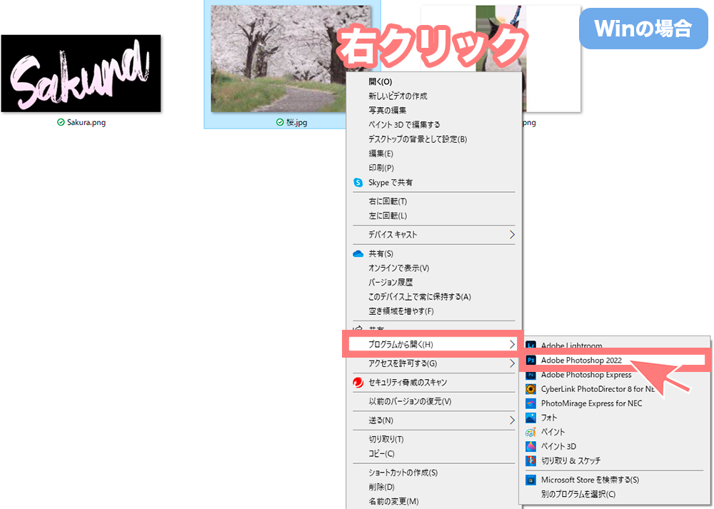 Windowsの場合は、写真をクリックして右クリックして、プログラムから開く▶︎Photoshopをクリックします。