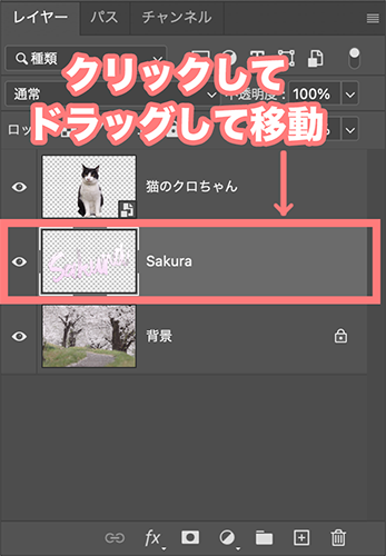 では、「Sakura」の文字のレイヤーをクリックしてドラッグして「猫のクロちゃん」の切り抜き写真のレイヤーの下に持ってきて離して、順番を入れ替えます。
