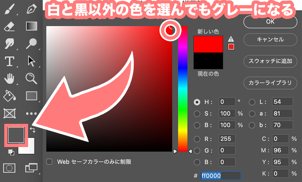ちなみに確実に白と黒を選ぶには、左の色の下に小さくある白と黒のところを押すか、キーボードのDを押すと色が確実に白と黒に設定されます。