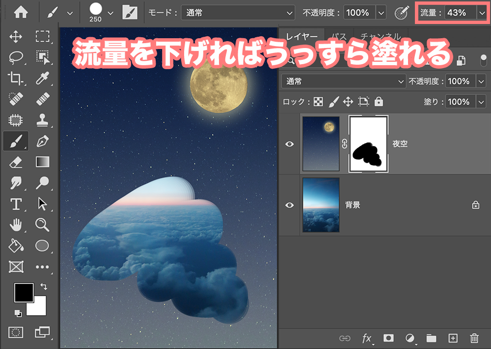 レイヤーマスクを使うときは必ず白か黒で塗るようにして、薄く塗りたい場合は上の流量を下げて塗ると、うっすら塗ることもできます。
