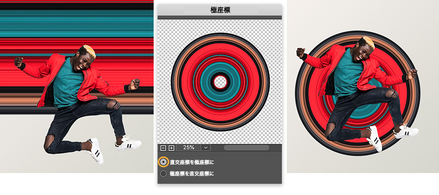 スマートオブジェクトレイヤーが選択された状態で、デフォルトの極座標を適用(フィルター/変形/極座標)して、水平方向の引き伸ばし効果を円形に変形させます。