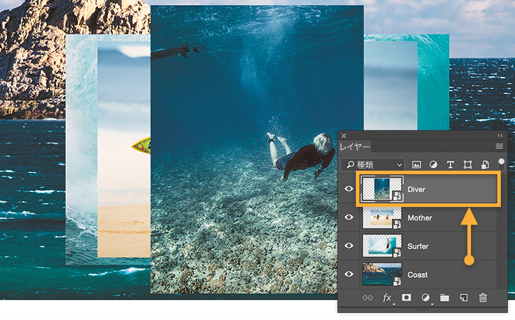 レイヤーパネルで、レイヤーを上にドラッグすると、その画像が他の画像よりも前面に移動します。下にドラッグすると背面に移動します。