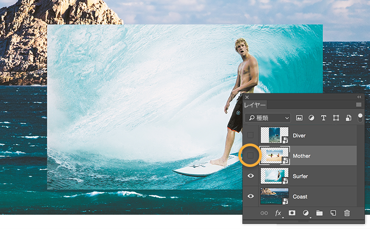 目のアイコンをクリックすると、そのレイヤーが非表示になります。もう一度クリックすると再び表示されます。