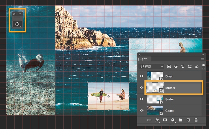 レイヤーパネルで、いずれかの画像レイヤーを選択し、移動ツールを使って、キャンバス上の画像の位置を動かします。画像のサイズを変更するには、レイヤーを選択し、Ctrlキー(Windows)またはCommandキー(Mac OS)を押しながらTキーを押して、ハンドルを表示します。ハンドルをドラッグして画像のサイズを変更します。個々の画像のサイズを変更して、独自のレイアウトを作成します。納得がいくまで、何度でも試行錯誤してかまいません。