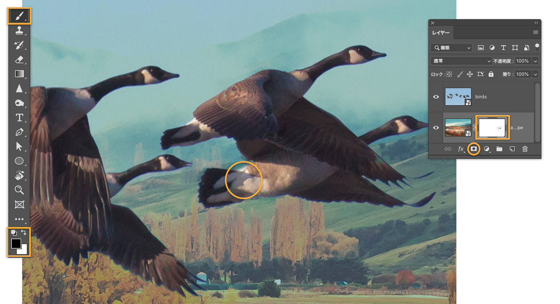 「比較(暗)」描画モードでは白い部分が透明になるので、鳥の体の明るい部分から風景が透けて見えていました。鳥を不透明に戻すために、風景のレイヤーにレイヤーマスクを追加し、ブラシツールを使用してレイヤーマスクの風景が透けて見えている部分を黒くペイントします。