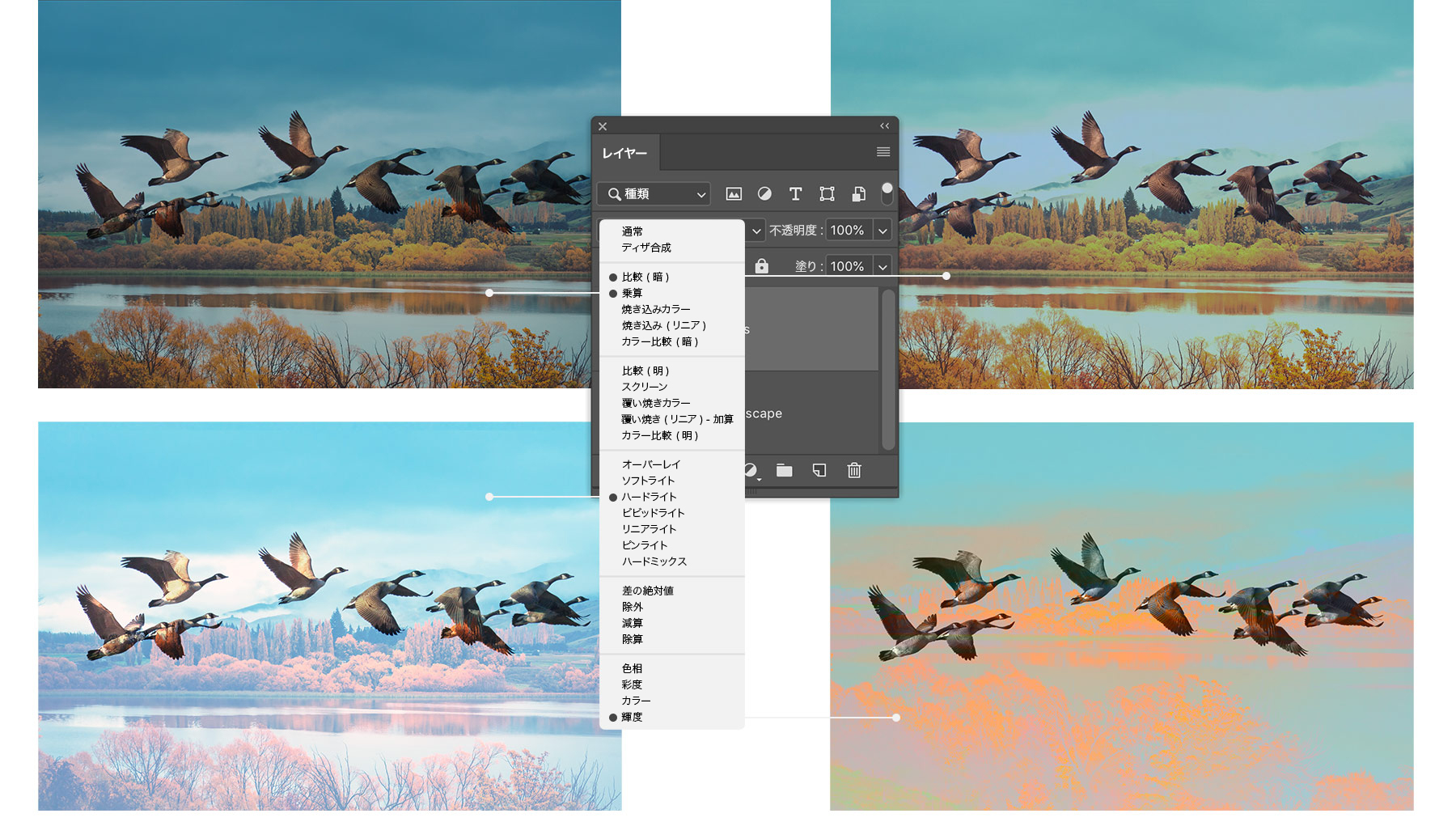 描画モードを設定すると、選択したレイヤーのピクセルがPhotoshopによって下のレイヤーとブレンドされます。ピクセルのブレンド方法は、選択するモードによって異なります。鳥のレイヤーを選択し、レイヤーパネルの描画モードをポイントして効果のプレビューを表示して、お好みの効果を探してみましょう。