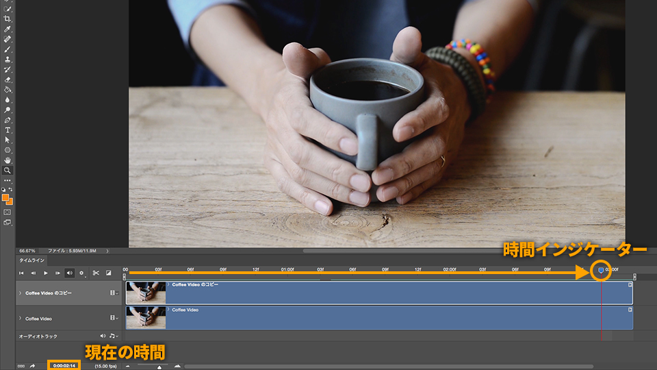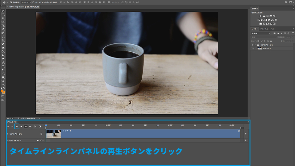 Photoshopを起動し、「ファイル」→「開く」をクリックして、ダウンロードしたサンプルファイル(coffee-cup-hands.mp4)を開きます。カンバス上にビデオ画像が表示され、下部には「タイムライン」パネルが表示されます。「タイムライン」パネルの再生ボタンをクリックして、ビデオが再生してみましょう。