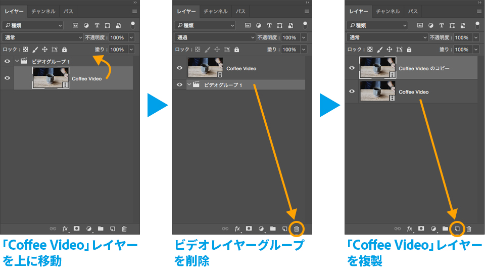 「Coffee Video」レイヤーをビデオレイヤーグループの上にドラッグして外に出します。ビデオレイヤーグループは、パネル下部の「レイヤーを削除」ボタンをクリックして削除しておきましょう。