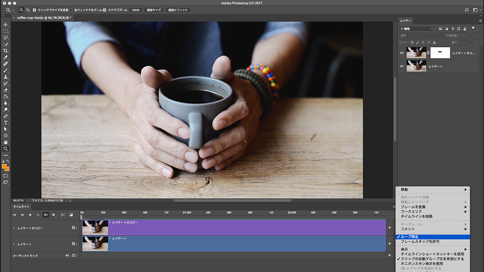 「タイムライン」パネルの再生ボタンをクリックして、再生してみましょう。静止画の中で、コーヒーだけが揺れ動いているシネマグラフが完成しました。