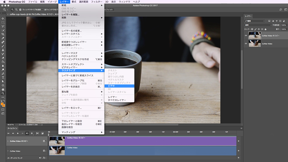次に、「レイヤー」パネルの「Coffee Videoのコピー」レイヤーを選択した状態で、「レイヤー」→「ラスタライズ」→「ビデオ」をクリックします。これで、「Coffee Videoのコピー」レイヤーが静止画として固定されました。