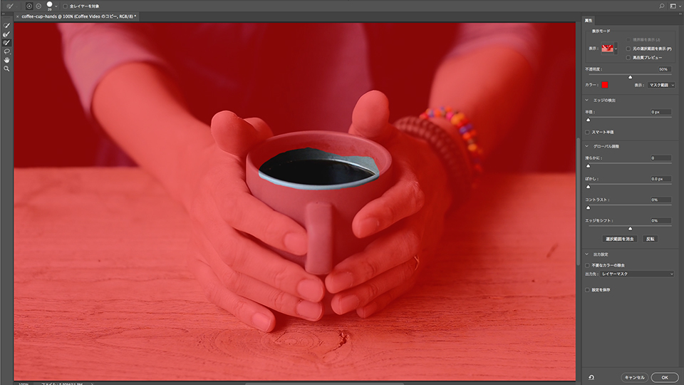 画面上部にある「選択範囲」メニューから、「選択とマスク」をクリックします。画面右に「属性パネル」が表示されるので、「表示モード」の「表示:」プルダウンメニューをクリックし、「オーバーレイ」を選択します。