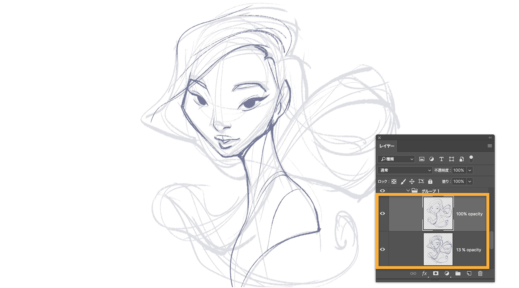 筆圧感知スタイラスとタブレットを使い、まずラフスケッチを描画します。カラーを選び、粗いブラシで顔と首のアウトラインを描画します。ブラシのサイズを切り替えて、顔は太い線、髪の毛は細い線と様々な線幅のストロークを使い分けます。全体を描き終えたら、レイヤーの不透明度を「13%」に変更し、新規レイヤーを作成します。新規レイヤーを選択して、傾斜のある濃いブラシでアウトラインをトレースし、スケッチを仕上げます。