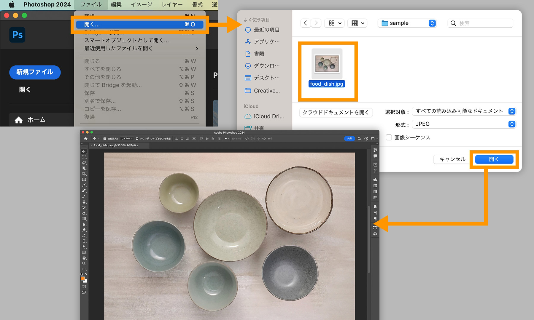 Photoshopを起動し、「ファイル」→「開く」からダウンロードしたサンプルファイル「food_dish.jpg」を選択して「開く」をクリックします。