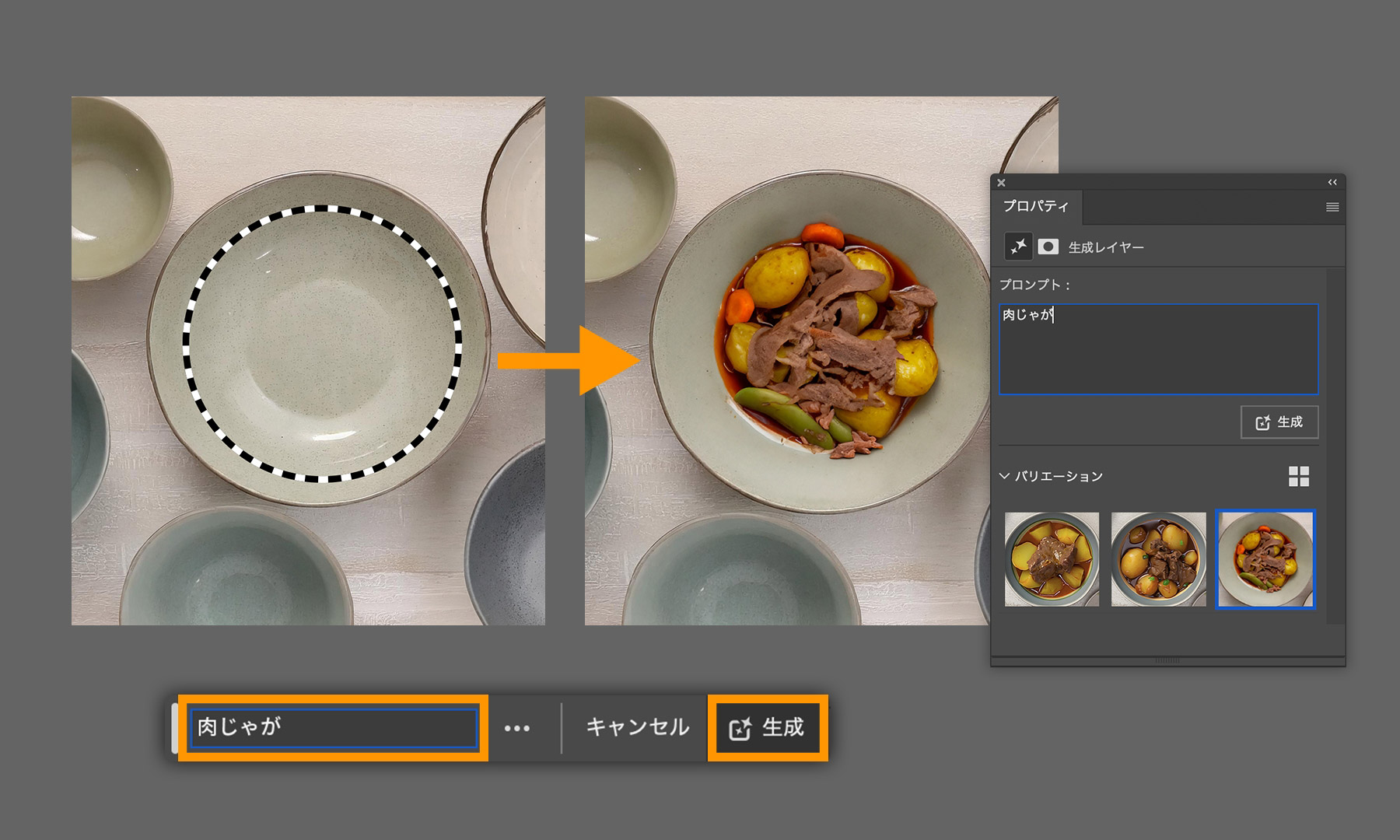 画像の下に表⽰されているコンテキストタスクバーのプロンプトフィールドに「⾁じゃが」と⼊⼒し、右側の「⽣成」ボタンをクリックすると、⾷器の中に⾁じゃがの画像が⽣成されます。