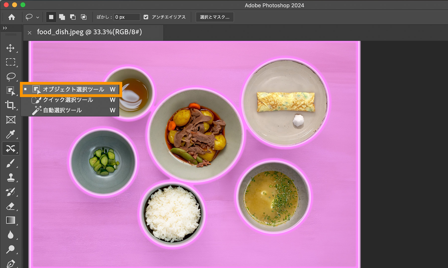 ツールバーから「オブジェクト選択ツール」を選んで、料理以外の背景領域にマウスポインターを合わせると、オーバーレイカラーでハイライト表⽰されます。そこでクリックすると、背景領域だけが選択されます。