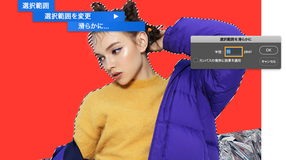 「選択範囲/選択範囲を変更/滑らかに」を選択して、半径を「10 pixel」に設定します。