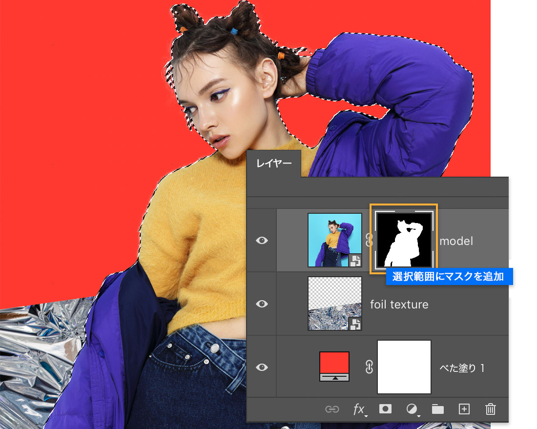 レイヤーパネルの「レイヤーマスクを追加」ボタンをクリックし、モデルの選択範囲をマスクに変換します。これで元の画像に影響なく選択範囲を編集できます。