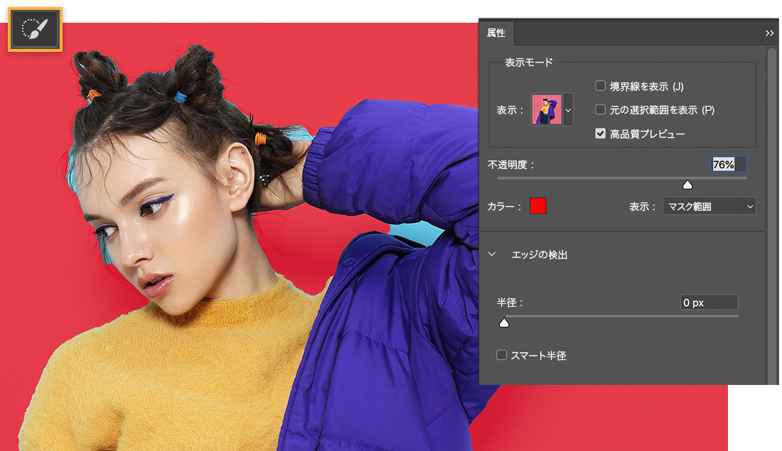 選択とマスクのワークスペースで、境界線調整ブラシを使用してペイントし、モデルの髪とセーターに入り組んだ領域背景部分を削除します。次に、「選択とマスク」の属性パネルの一番下にある「出力先」で「選択範囲」を選択して、「OK」をクリックします。