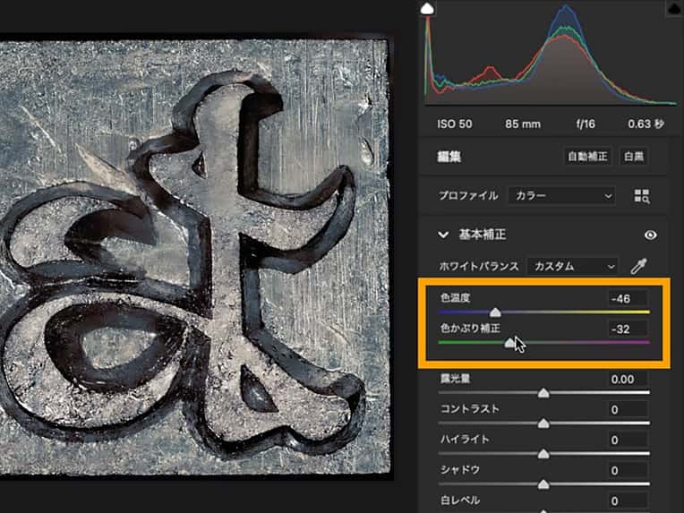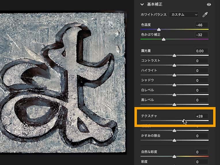 「基本補正」の中にある「テクスチャ」を使って、金属の硬質なニュアンスを強調しましょう。「テクスチャ」のスライダーを調整することで、被写体の質感を強めたり弱めたりすることができます。
