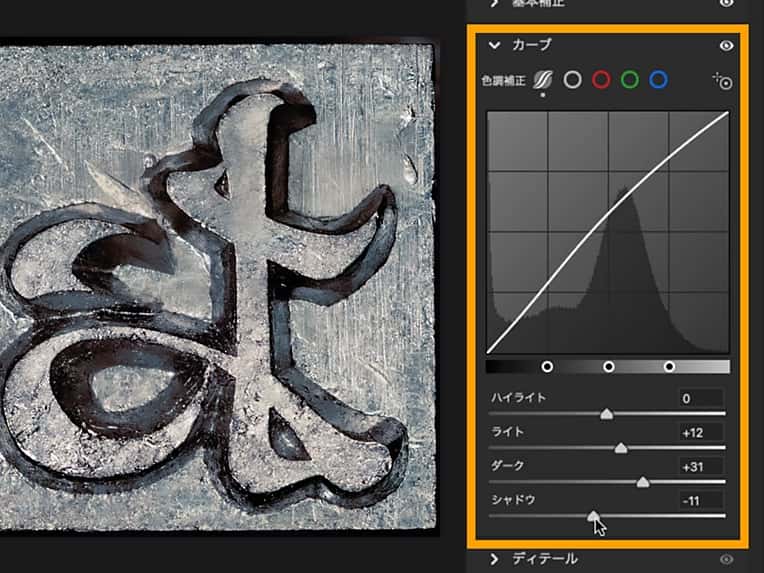 「カーブ」の中にある、「ハイライト」「ライト」「ダーク」「シャドウ」のスライダーを動かして、写真を頭の中にあるイメージに近づけます。明るいエリアを調整したいときは「ハイライト」「ライト」のスライダーを動かします。影のエリアを調整したいときは「ダーク」や「シャドウ」を動かします。