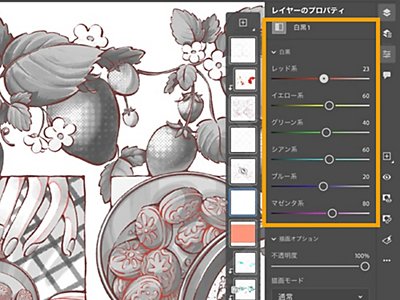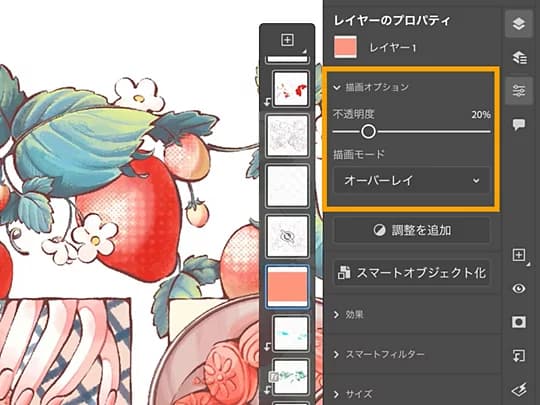 タスクバーから「レイヤーのプロパティ」パネルを開き、描画モードを「オーバーレイ」、不透明度を「20%」に設定します。イラスト全体に赤味が加わりました。