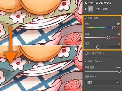 「レイヤーのプロパティ」パネルを開き、色相を「123」、彩度を「38」、明度を「+28」に設定します。ナプキンの色が変わりました。