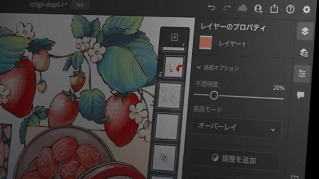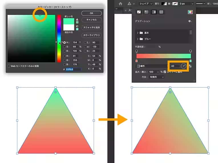 最後に「塗り」パネルで「グラデーションを回転」の数値を「40」度に設定し、グラデーションの角度を変更します。これでオブジェクトの完成です。色を選ぶ時は、写真からスポイトツールで色を選んで合わせたり、作品のイメージに合わせたカラーパレットを予め作成しておくと、統一感のある作品に仕上がります。
