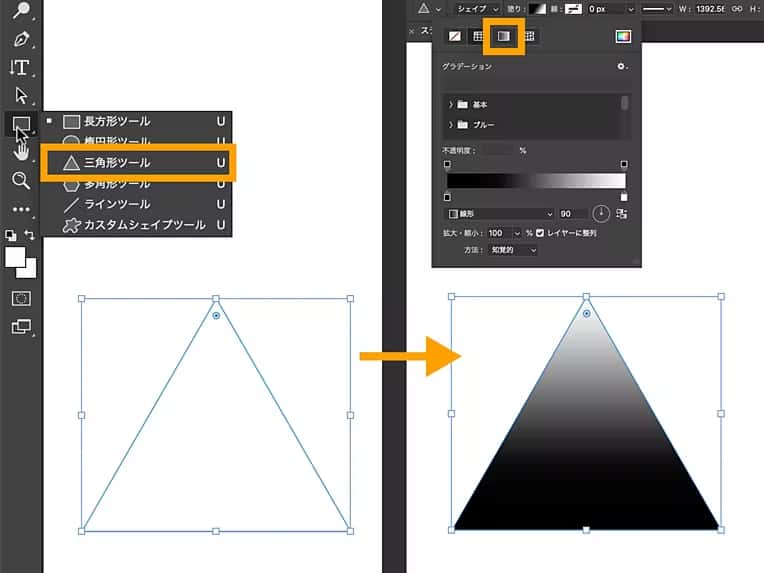 オプションバーの「塗り」をクリックしてパネルを表示し、「グラデーション」を選択します。