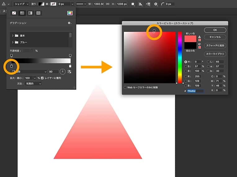「塗り」パネルで、グラデーションのスライダー左下の「カラー分岐点」をダブルクリックして「カラーピッカー」パネルを開き、カラーフィールドでピンクを選んで「OK」をクリックします。